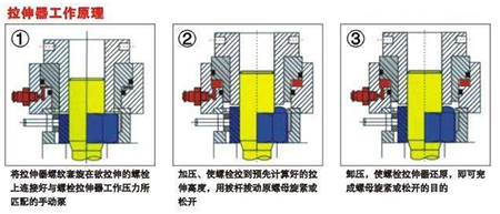 液壓螺栓拉伸器一般由液壓泵、高壓軟管、壓力表和拉伸體組成。其中液壓泵為動力源,壓力表反映泵的輸出壓力,高壓軟管聯(lián)接液壓泵和拉伸體。拉伸體是實現(xiàn)螺栓拉伸的執(zhí)行元件。主要由活塞缸、活塞、支承橋和拉伸螺母組成。結(jié)構(gòu)如下圖所示。工作時,動力源輸出的高壓油經(jīng)高壓軟管輸送至活塞缸3,在壓力作用下活塞缸中的活塞上移,帶動拉伸螺母向上移動。拉伸螺母與工作螺栓螺紋聯(lián)接,從而拉長工作螺栓,使螺栓伸長達到所要求的變形量,變形控制在彈性變形范圍之內(nèi),然后進行預(yù)緊或拆卸作業(yè),最后通過液力或者機械回位的方式使工作螺栓回復(fù)原來的形狀,完成作業(yè)。